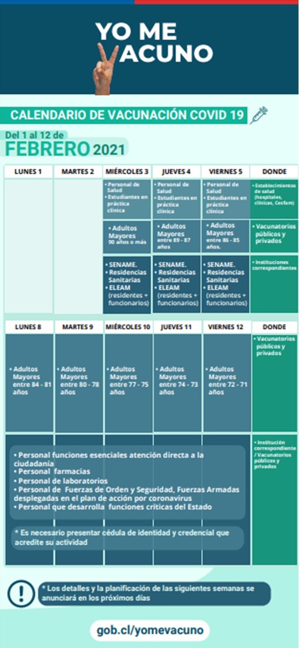 *Este calendario está sujeto a cambios, en función de la llegada, aprobación y recomendación de uso de las distintas vacunas. Cualquier cambio será debidamente informado por las autoridades del Ministerio de Salud y publicado en las redes oficiales del Gobierno de Chile.