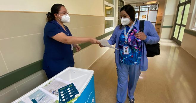 “Es de conocimiento público que hace un par de semanas se comenzó a presentar un alza importante de contagios por COVID-19, específicamente por causa de la variante Ómicron, la cual es la variante predominante en nuestro país. Es por ello que hoy, y como una forma de educar y concientizar a nuestros funcionarios/as sobre el cuidado que deben tener frente a esta nueva variante, realizamos un stand informativo que se replicará todas las semanas en la entrada de nuestro hospital, para mantener a nuestro personal clínico y administrativo informado acerca de los posibles cambios de fase y sobre el reforzamiento de las medidas de autocuidado que deben tener al interior del lugar de trabajo donde se desenvuelven”, señaló la enfermera encargada de IAAS.