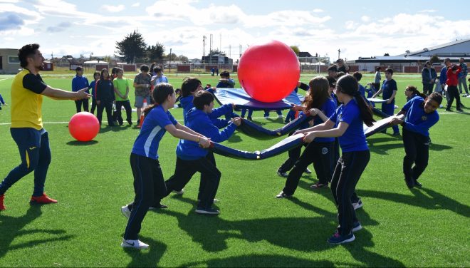 La actividad, que en esta oportunidad convocó a 300 escolares entre 5° y 6° básico de Punta Arenas, reunió a once establecimientos educacionales que disfrutaron de un encuentro formativo- recreativo, a cargo del Programa “Crecer en Movimiento” del Instituto Nacional de Deportes que desplegó actividades formativas recreativas, en un formato lúdico, donde los niños/as tuvieron un momento de esparcimiento a través de juegos y dinámica recreativas.