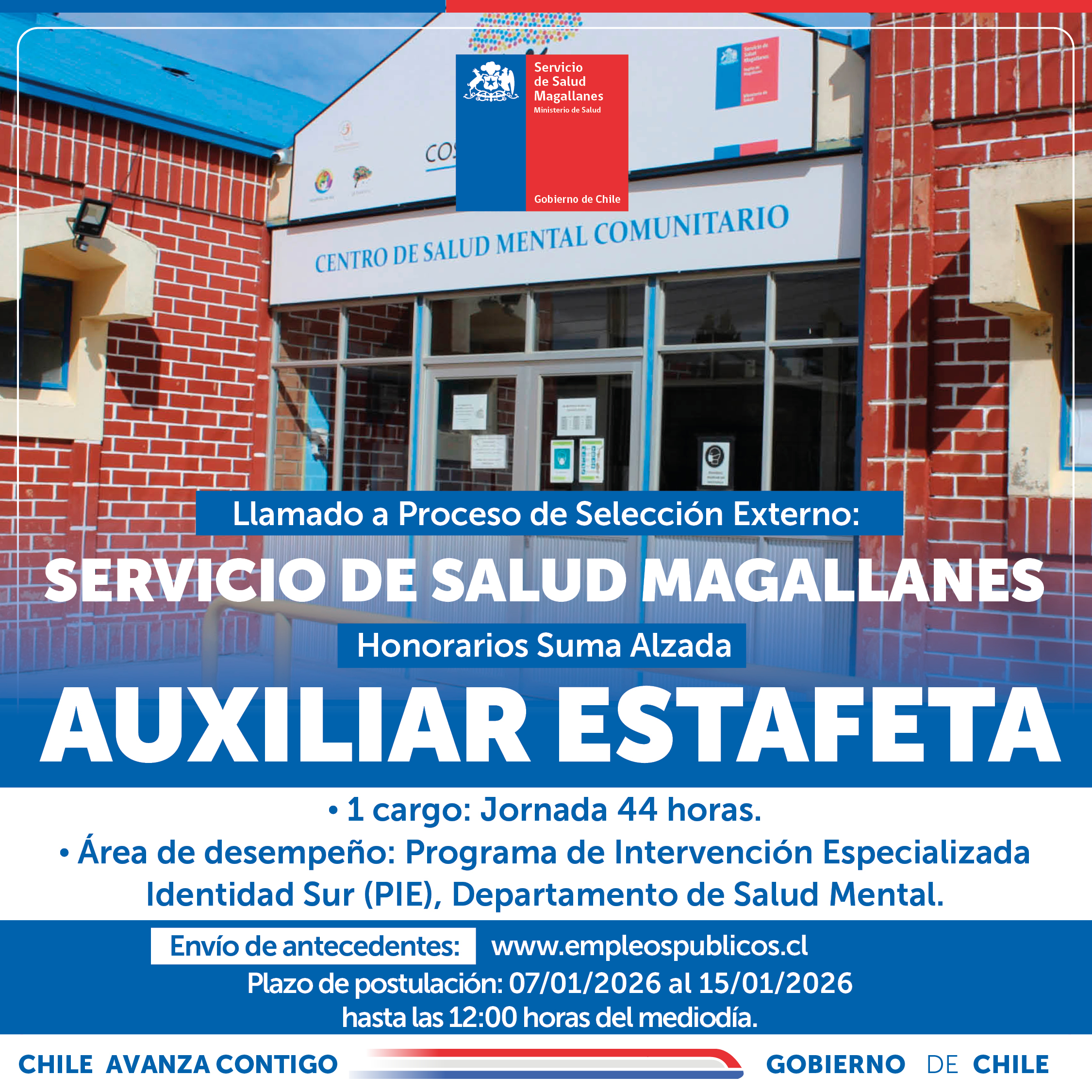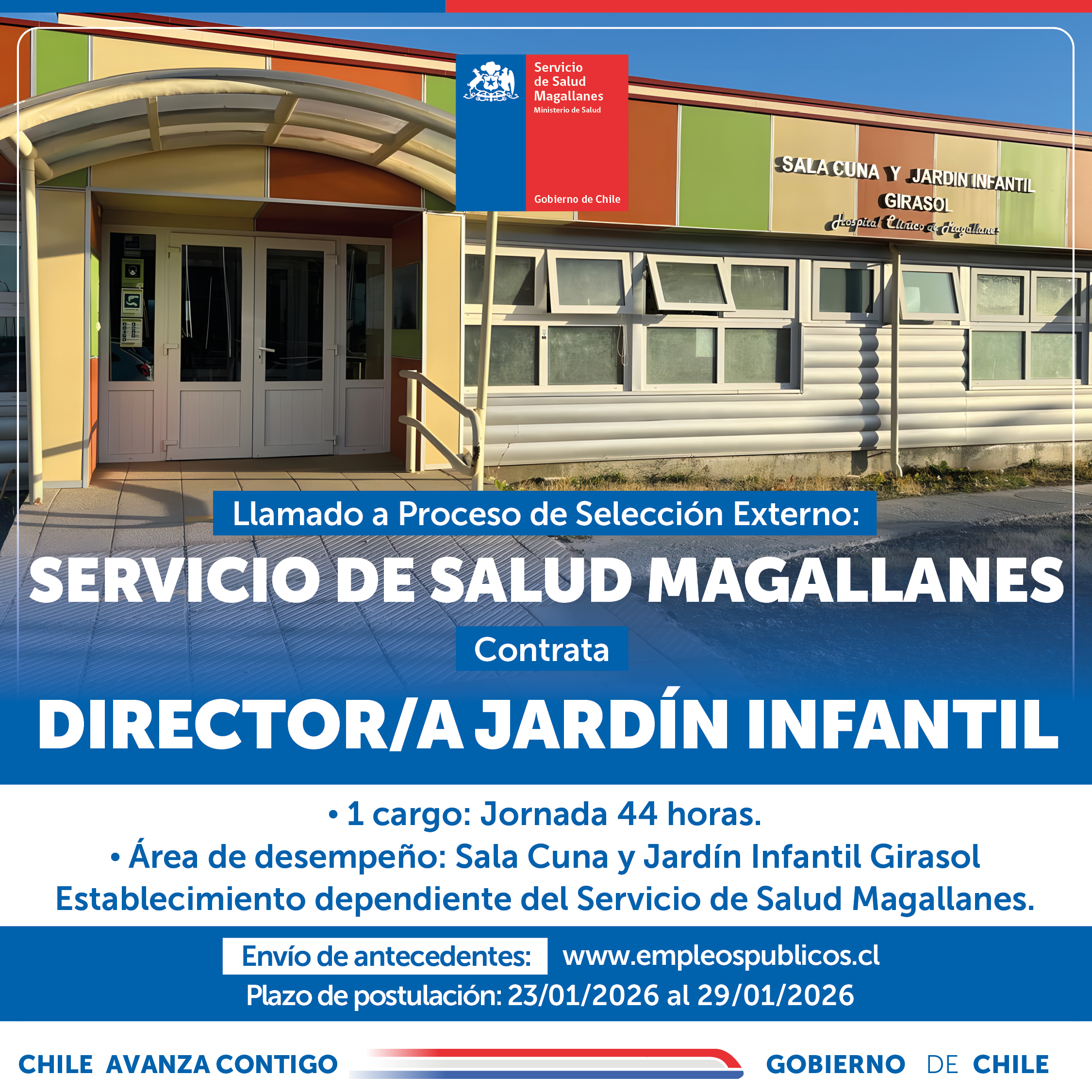 “PROCESO DE SELECCIÓN EXTERNO” «DIRECTOR/A JARDÍN INFANTIL» SALA CUNA Y JARDÍN INFANTIL «GIRASOL» SERVICIO SALUD MAGALLANES (23.01.2026) BASES PROCESO Resolución Exenta N° 316/19.01.2026, Aprueba Bases para Llamado Selección Externo al Cargo de “DIRECTOR/A JARDÍN INFANTIL”, para desempeñarse en Sala Cuna y Jardín Infantil «Girasol» establecimiento dependiente del Servicio de Salud Magallanes: Descargar RESOLUCIÓN EXENTA N°315/19.01.2026, que Aprueba Perfil de Cargo “DIRECTOR/A JARDÍN INFANTIL”, perteneciente a Sala Cuna y Jardín Infantil «Girasol» establecimiento dependiente del Servicio de Salud Magallanes: Descargar PERFIL DE CARGO:Descargar AFICHE: Descargar Para postular únicamente en portal de empleos públicos Click aquí.