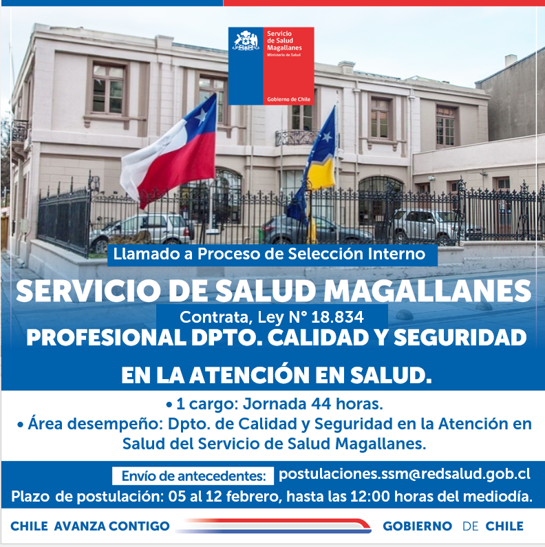 RESOLUCIÓN EXENTA N°293/16.01.2025, que aprueba perfil de cargo de «PROFESIONAL DEPARTAMENTO CALIDAD EN LA ATENCIÓN EN SALUD«, de la Dirección del Servicio de Salud Magallanes: Descargar